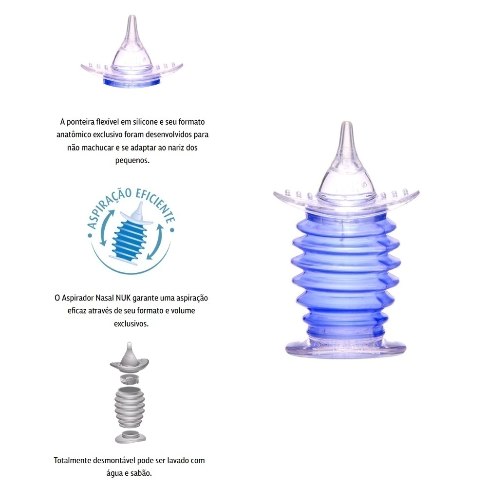 O Aspirador Nasal NUK aspira, com eficiência, as secreções nasais do bebê. Sua ponteira flexível em silicone é feita para não machucar as narinas dos pequenos, e seu formato anatômico exclusivo deixa o processo de aspiração muito mais confortável. Além disso, o Aspirador Nasal NUK é prático, ergonômico e fácil de limpar, pois possui um reservatório para o muco sob a tampa.