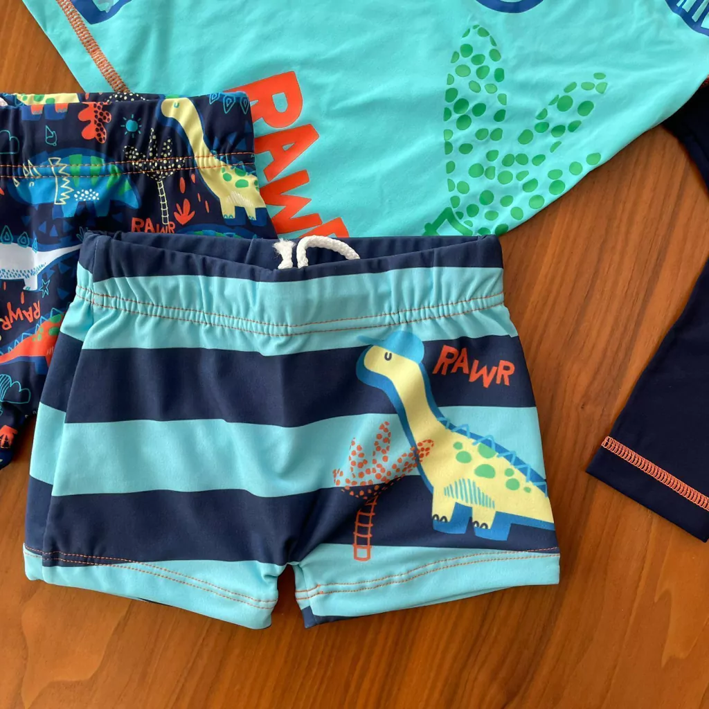 Detalhes que o Kit 3 peças praia dino elastano kids proteção uv50+ traz: